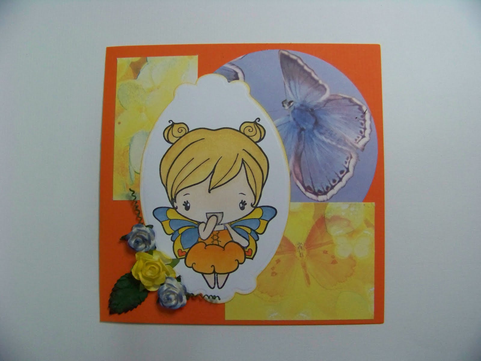 Ik heb mijn cc design stempel met de vlinder weer eens uit de kast getrokken. Wat andere leuke vlinderpapiertjes er bij en toen kwam dit kaartje er uit. Hij doet mee met de challenges van Create4fun - sketch en Anyone for Anya - colour challenge spring.
